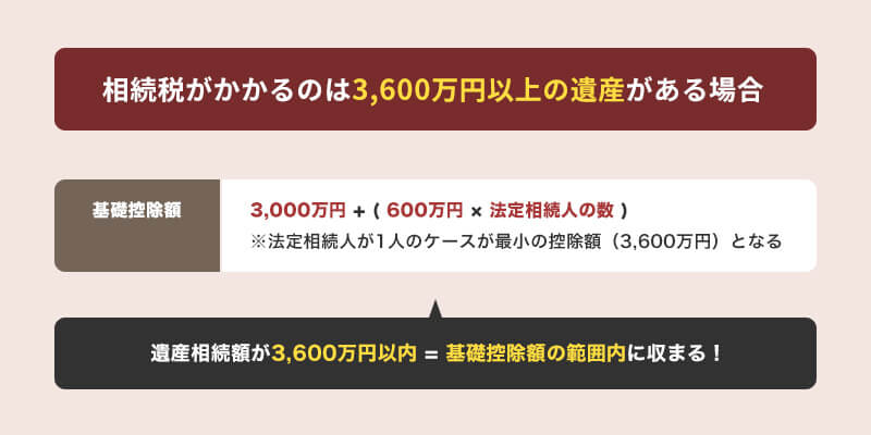 • 相続人が1人でも、基礎控除(3600万円)を大きく下回るため相続税は発生しません。
